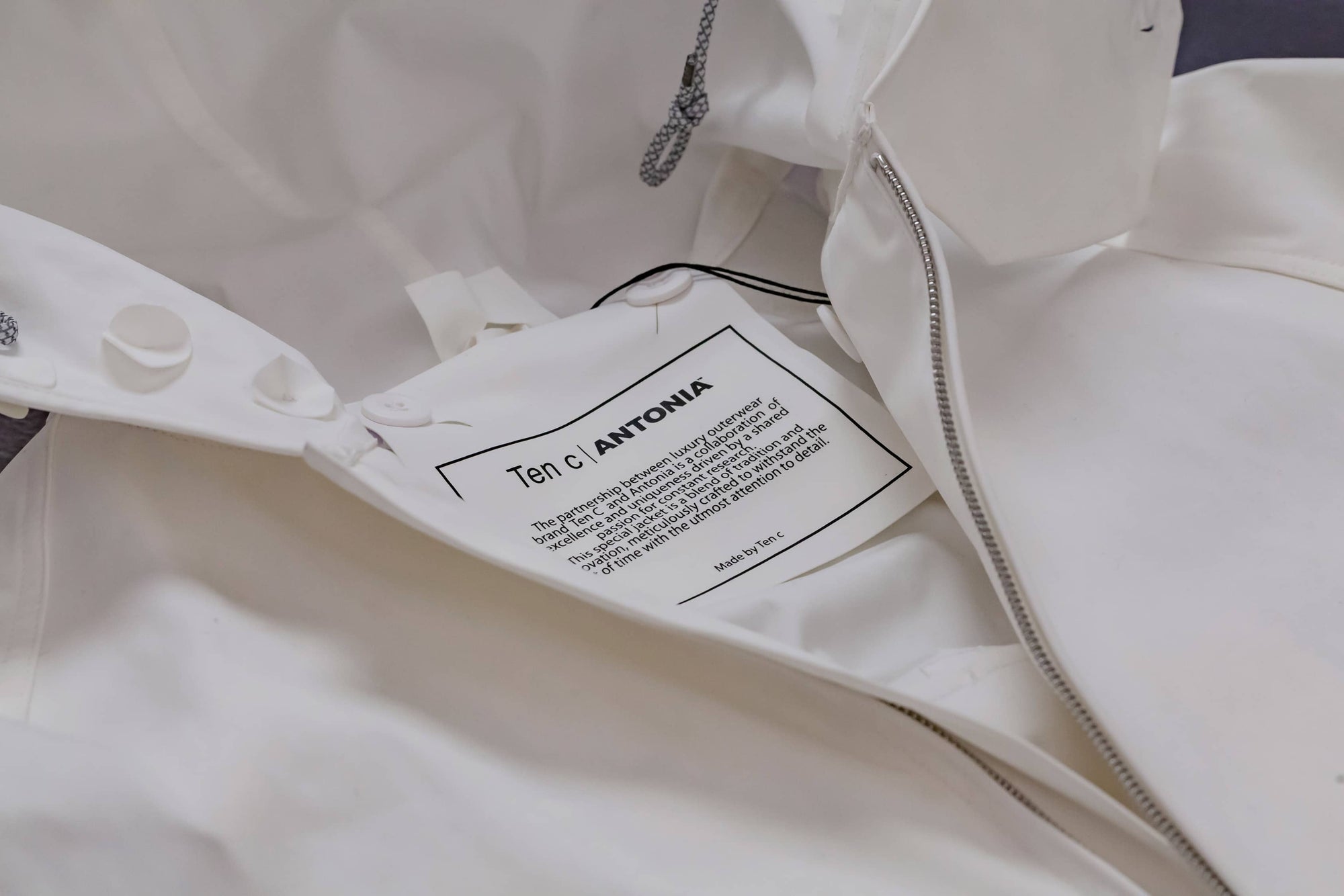 Il designer di Ten c, Alessandro Pungetti, rivisita i due capi iconici, utilizzando l'esclusivo OJJ, Original Japanese Jersey, puro non lavato, in un total white monocromatico, impreziosito da dettagli come i bottoni tono su tono, la stringa reflex del cappuccio e le speciali cerniere per arricchire in modo unico la capsule. Le giacche presentano inoltre una stampa reflex sul retro con le coordinate dei due negozi Antonia di Milano.